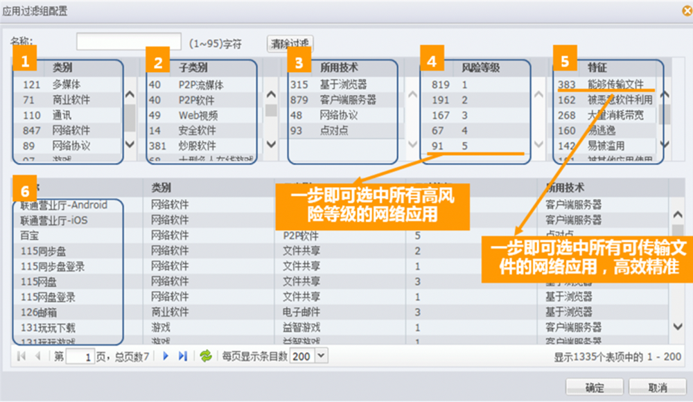 ●精准应用筛选。evo真人视讯数码下一代防火墙给予了精细化的应用筛选机制。用户可根据应用名称、应用类别、应用子类别、风险级别、所用技术、应用特征等6大条件。精确筛选出感兴趣的应用类型,如具备文件传输功能的通讯软件,或存在已知漏洞、基于浏览器的WEB视频应用等等,从而实现精细化的应用管控。