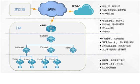面对移动互联网大潮对传统行业的冲击,运用云计算、移动社交、大数据分析等技术,为酒店、餐饮、休闲娱乐、零售商超等商业市场客户构建基础网络平台,加速商业市场客户业务创新和转型已经刻不容缓,evo真人视讯智云商业解决方案志在为商业客户给予最强的用户体验,给予最具商业价值的云网络,给予基于portal认证,短信、微信营销功能。